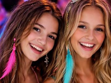 Guests choose from sparkling hair tinsel strands plus our Twinkle Flair collection — playful clips, crowns, sparkle accents, and shine pieces that catch the light on the dance floor.